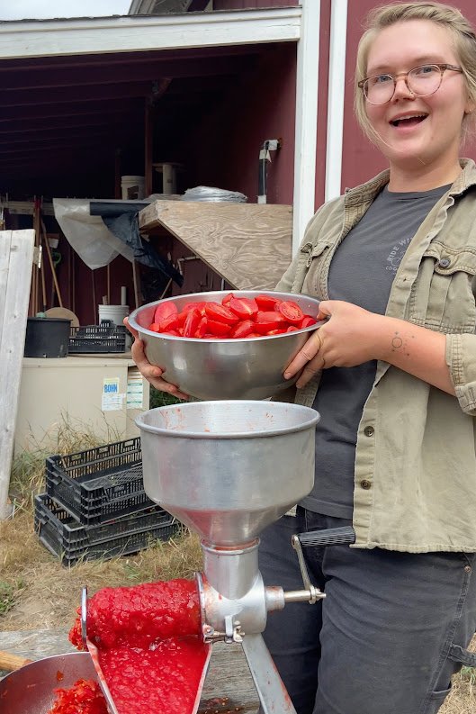 Many of our big bumper Summer crops have begun to taper off just in time for us to get ready for our next big project—storage. There’s a changing of the guard at play between the Summer Squashes (they’re done) and the Winter Squashes (they’re being cut and cured in the field on these dry days). And I don’t mean to sound the alarm, but the Tomatoes seem to be pumping the brakes just a little. In fact, today was our annual Pizza and Passata Day for the crew. Socking away a few quarts of sweet sauce is a treasured but humble way to celebrate work they’ve done to bring us thousands and thousands of incredible tomatoes this Summer. They pressed a little bit more than 25 quarts after the morning harvest, and we fired up some pizzas in the backyard for lunch. (The color of the sauce is like nothing other, and it makes for a relaxing albeit messy afternoon.)