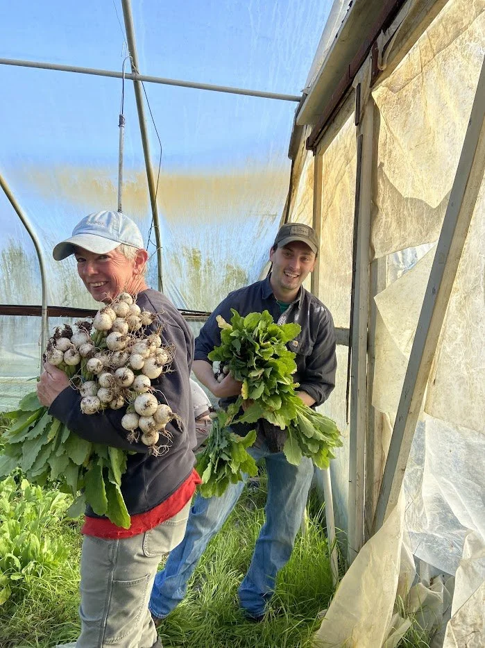 The heat, the harvest, the pressure to keep up (or stay ahead, if you’re Mark). They’re hitting hard on this particular Monday as we are reacquainting ourselves with what feels like when are putting more into the field than we are taking out in a given week. Tis’ the season! Sudden sunshine brings out great vibes and lots of opportunities to get good work done, but it also brought on a mildly-successful trial bed of Spinach and armloads of Tokyo Turnips and in the greenhouse that couldn’t wait. Little white Tokyo Turnips, aka Hakurei, are one of the sweetest Springtime crops we grow. Just last week, one of our CSA members sent me this awesome video about Tokyo Turnips, featuring Japanese farmers and cooks discussing what makes this vegetable so great. (Thank you, Shoko!) Though recipes abound for cooking, stir frying, roasting and sautéing them, they're a real treat sliced up and eaten raw. Being greenhouse-grown, the leafy greens are extra tender. Easy, delicious Spring food.